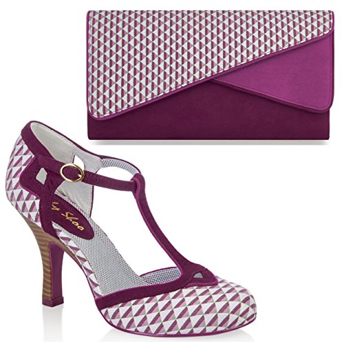 Matching set of Hatty Shoe and Sydney bag. New T bar shoe HATTY features Art Deco inspired styling, with angular cutouts and clean lines. Choice of vintage inspired retro geometric jacquard uppers or classic navy and white polka dot. The patterns are set off nicely with contrast piping and delicate micro dot linings. Twin flap clutch bag SYDNEY features contrasting panels of geometric prints and plain faux suede and has two inner compartments plus a small pocket with metal Ruby Shoo logo. The detachable metal chain strap tucks neatly inside the bag, and the flaps fasten with hidden magnetic closures. SHOE Upper: Textile Lining: Textile Sole: Man made materials Heel height: 90mm HANDBAG Outer: Textile Lining: Textile Width:290mm Height:150mm Depth: 45mm Strap length:870mm